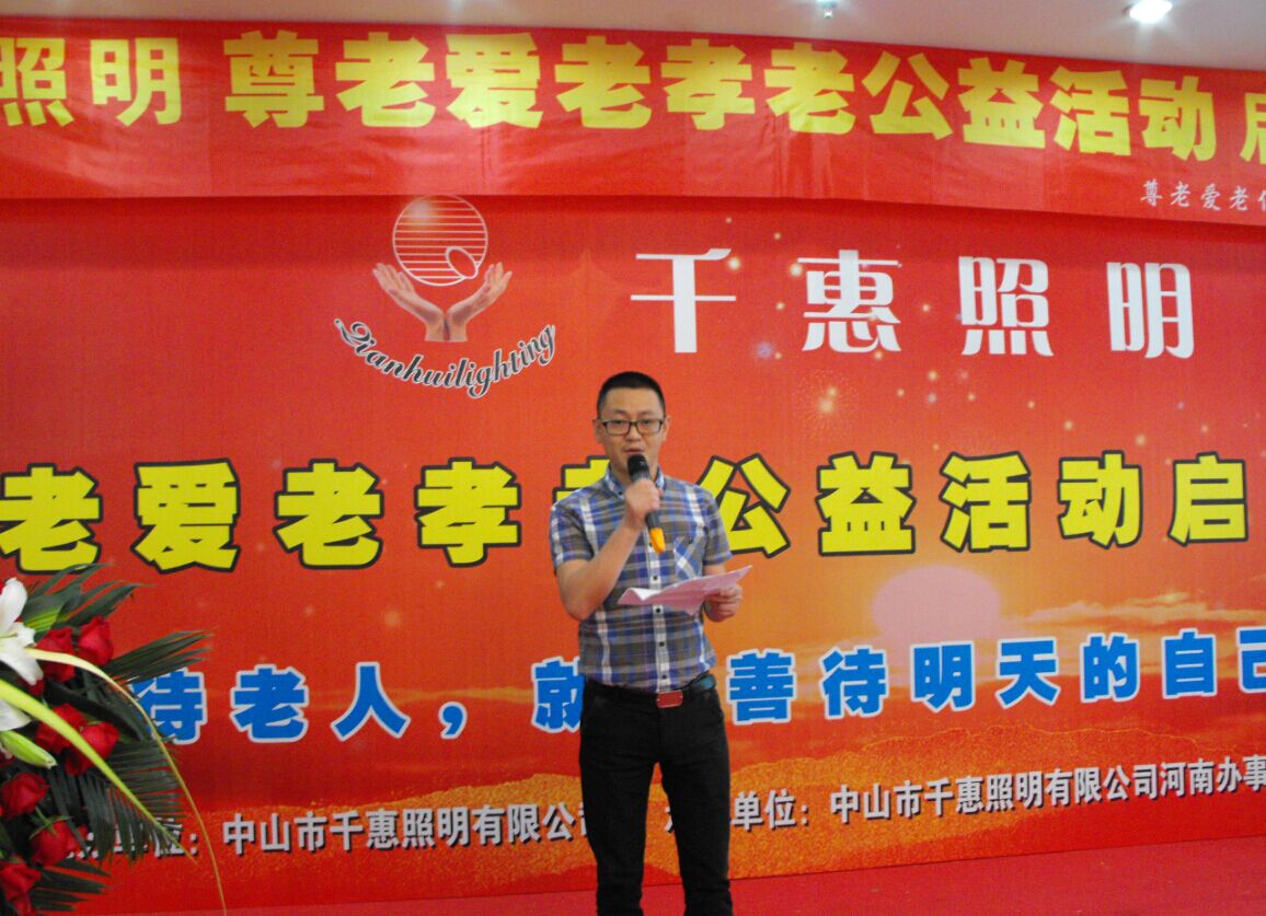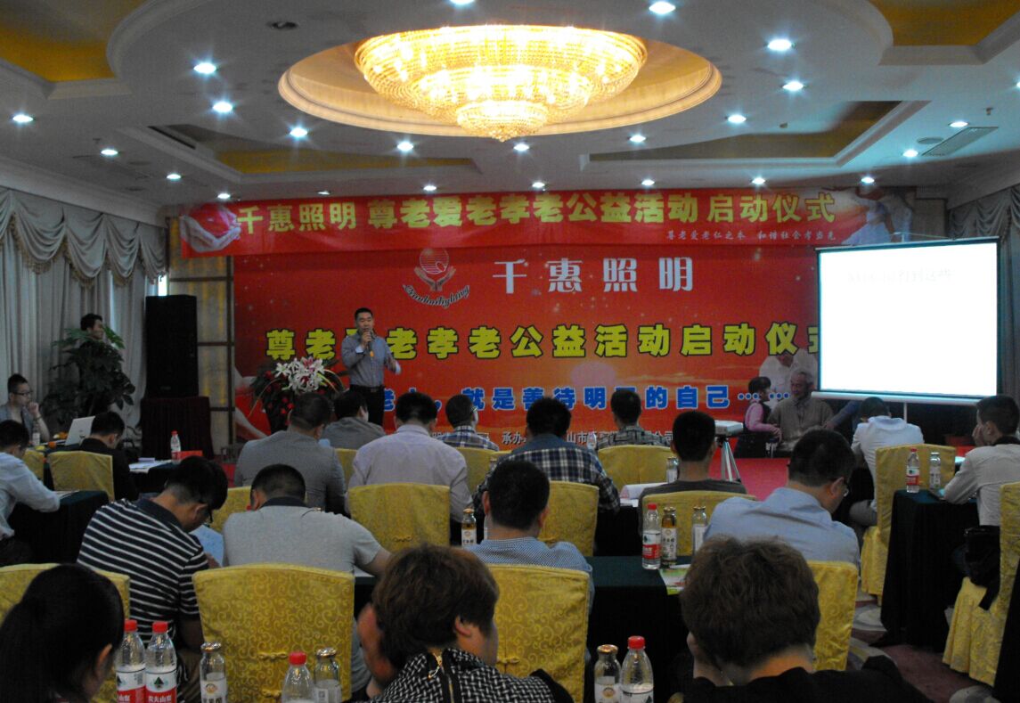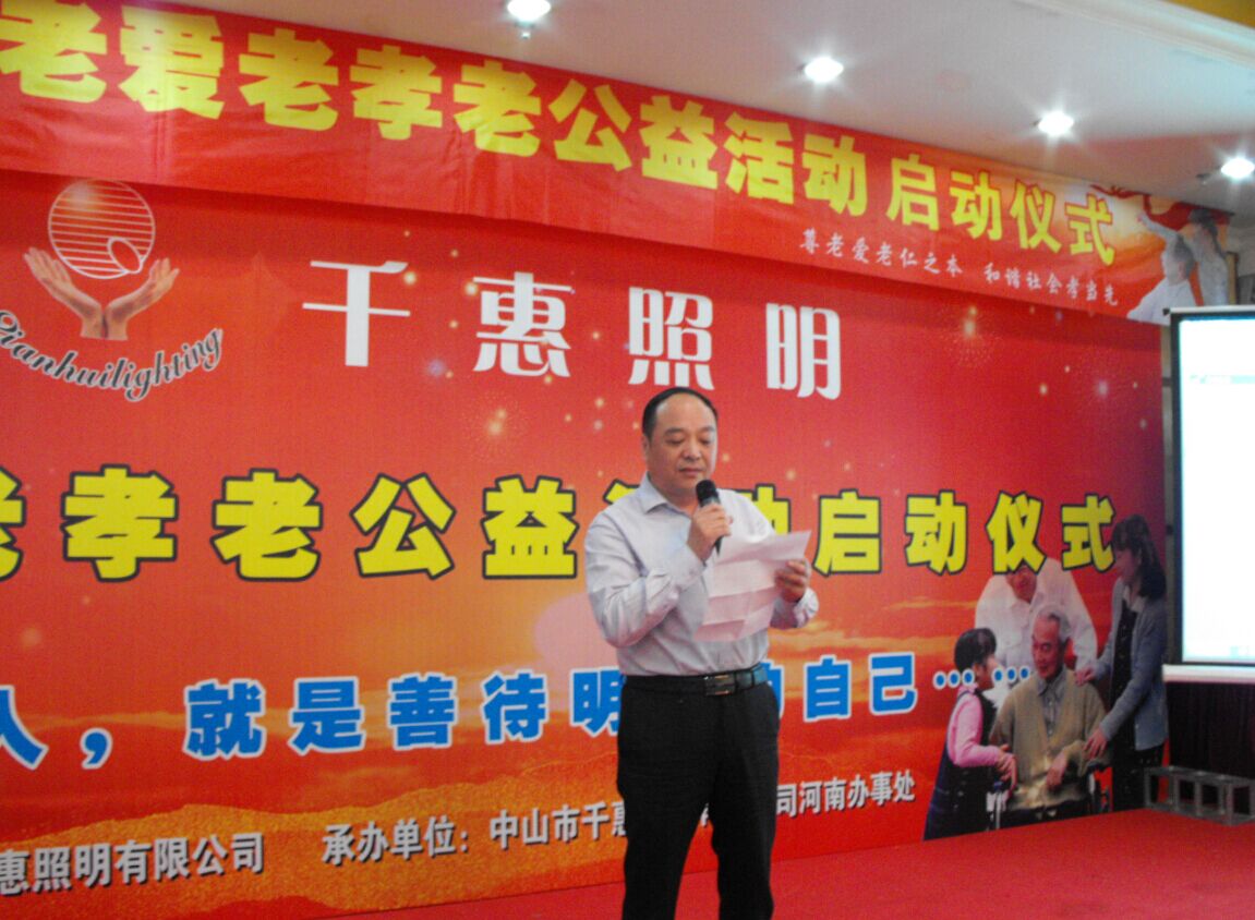 4月26日,千惠照明尊老愛老孝老公益活動(dòng)啟動(dòng)儀式在鄭州豐樂園大酒店隆重舉行。河南照明燈飾商會執(zhí)行會長張雙來,中山千惠照明董事長萬成賓,千惠照明河南辦事處總經(jīng)理丁飛,河南零售業(yè)協(xié)會會長安留杰,河南豫宛照明商會會長張建功,漯河企業(yè)家協(xié)會會長姚啟山,資深節(jié)目主持人藍(lán)月和來自河南照明行業(yè)的60名經(jīng)銷商與會。