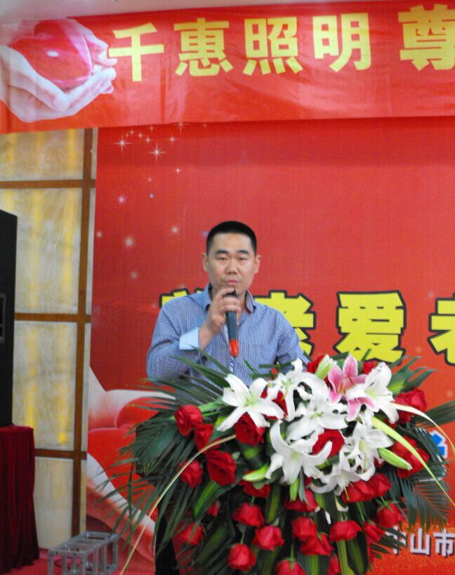 接著,中山千惠照明董事長萬成賓發(fā)表講話,他首先對前來參加本次活動(dòng)的嘉賓表示歡迎,并對多年來直接和間接支持千惠照明發(fā)展的各屆人士表示感謝。萬成賓表示,千惠照明河南辦事處總經(jīng)理丁飛在做好經(jīng)營的同時(shí),不忘社會責(zé)任,是一位有著大愛和善舉的經(jīng)銷商。作為廠家,中山千惠照明有限公司將對這項(xiàng)公益活動(dòng)大力支持,特別拿出部分款式的產(chǎn)品作為愛心燈,將所得的利潤注入千惠照明愛心基金,用于幫助那些需要幫助的孤寡老人,困難家庭和殘障人士。同時(shí),也把千惠照明的愛心傳遞給更多的家庭。