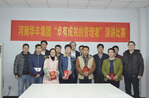 2015年12月25日下午,河南華豐集團(tuán)“卓有成效的管理者”演講比賽在華豐燈飾界五樓會(huì)議室隆重舉行。 此次演講比賽由河南華豐集團(tuán)有限公司行政管理中心副總監(jiān)、河南華豐投資有限公司人資行政部部長(zhǎng)閻冬冬,河南華豐投資有限公司總經(jīng)理助理兼項(xiàng)目運(yùn)營(yíng)部部長(zhǎng)楊軍、河南華豐集團(tuán)有限公司行政管理中心副部長(zhǎng)張都擔(dān)任評(píng)委。