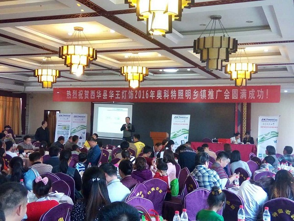 4月24日,西華縣華王燈飾2016年奧科特照明鄉(xiāng)鎮(zhèn)推廣會(huì)隆重舉行!奧科特照明國(guó)內(nèi)營(yíng)銷總經(jīng)理張興華、河南分公司經(jīng)理劉利、河南雙歐光電總經(jīng)理劉建軍、銷售總監(jiān)劉紅曉、西華縣華王燈飾總經(jīng)理王川和來(lái)自西華各鄉(xiāng),鎮(zhèn)市場(chǎng)的100余名經(jīng)銷商和水電工參加會(huì)議。