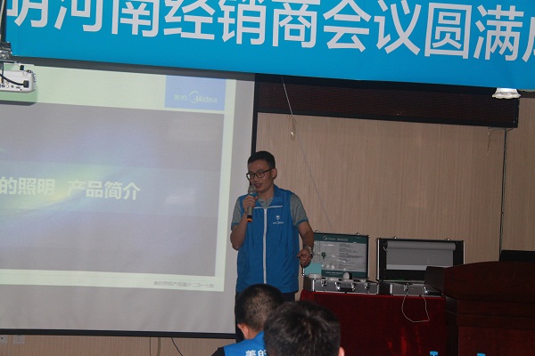 美的照明國內(nèi)營銷部部長史志鵬、產(chǎn)品經(jīng)理陳德健、美的照明河南運營中心總經(jīng)理王建軍,營銷總監(jiān)范占博、河南美的暖通設(shè)備銷售有限公司照明產(chǎn)品經(jīng)理王蒙和來自河南的近100名經(jīng)銷商與會。